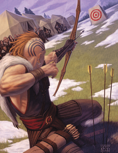 It’s the blue tattoos that make me think Navarr, the rest is leather kit that wouldn’t be out of place in Navarr or Wintermark, or possibly the Marches either