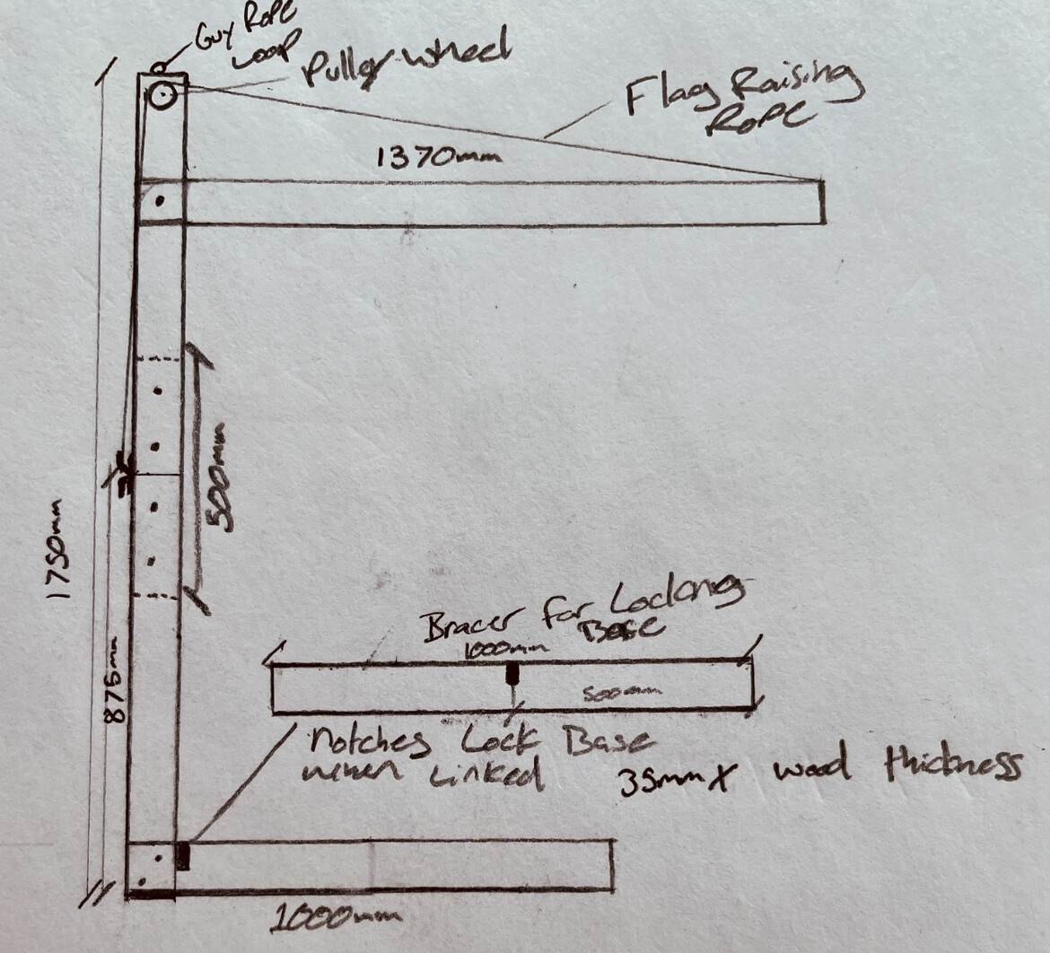 So @Darius_Marcher i need the timber lengths widths and thicknesses of all pieces along with the open dimensions of the map flag, as with what I have had quite as an idea with the timbers you should be able to build a mount that folds away splits in half without much more than a few bolts 14mtrs of 4mm sisal rope (that includes 4x guy lines for windy days) 2x 1ft pieces of 1”x1” and a wooden pulley wheel but send me a message as I’ll be away for a few days but once I get full measurements I can draw out a step by step guide for you might even post it public for anyone to use