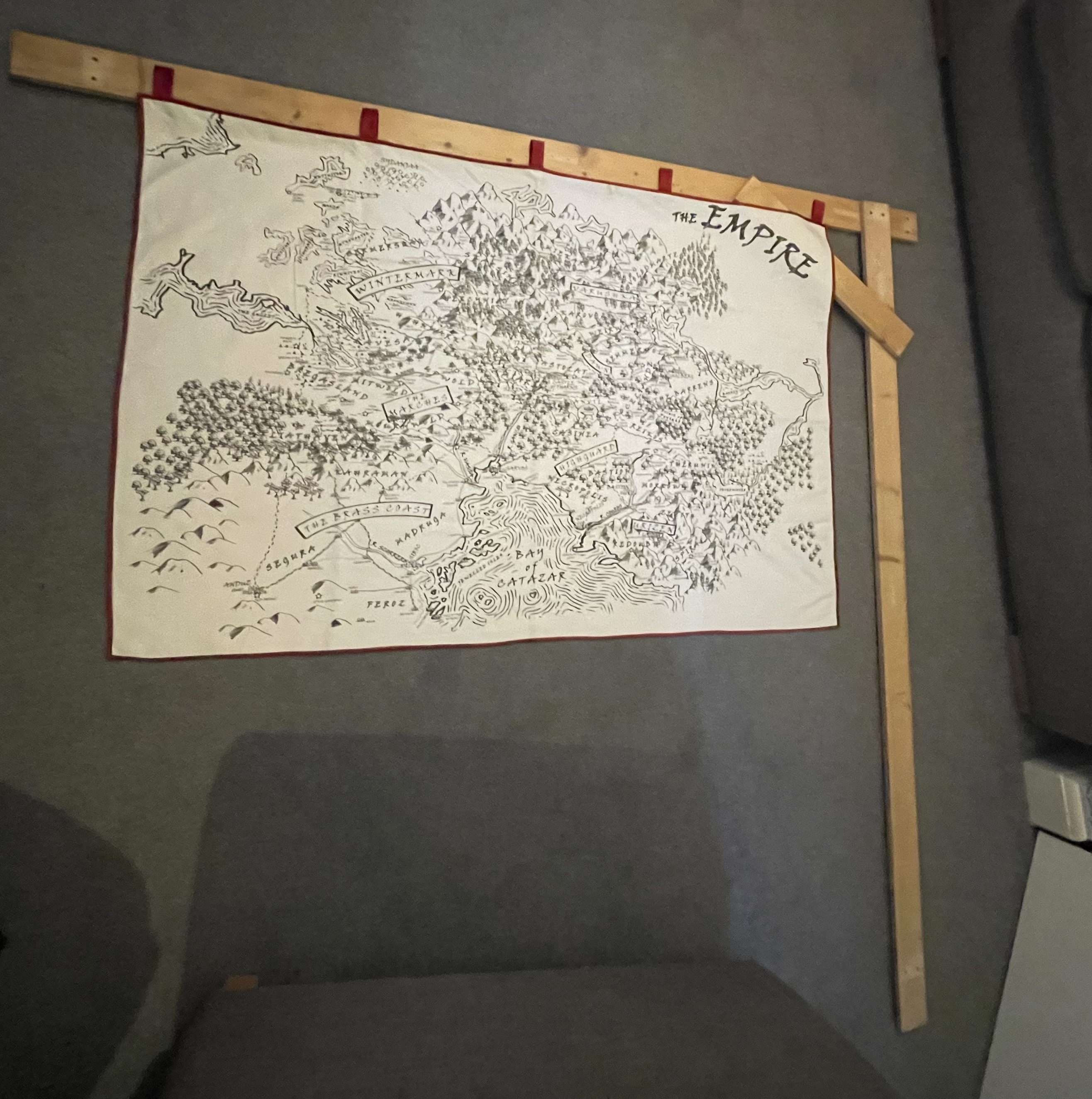 Can you measure the map size timber length & thickness on both axis and also rather than treading onto wood think more rope to be looser kinda like the moon landing flag net curtain wire would work and be able to be recessed