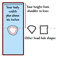 Cut a curve in the narrow edge or both rectangles for the head (wider if it needs to go over armour), , sew the shoulder seams and then roll the neck edge and hem.