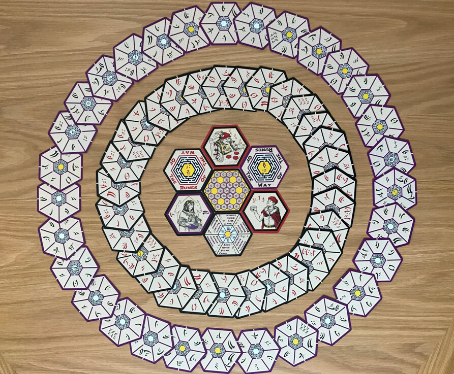 Runes Way is a deck of hexagonal cards that can be used to play three quick pattern-matching games by ‘The Guild of Good Games’: ‘The Way of The Runes’, ‘The Runes of The Way’ and ‘Runic Skein’.