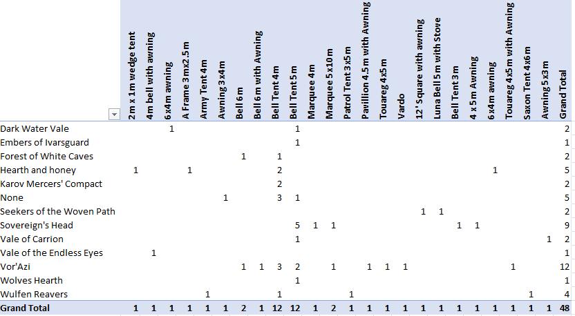 Below is a count by Group and Tent type that I currently have. This is mainly to ensure that the main group tents have been entered once and only once.