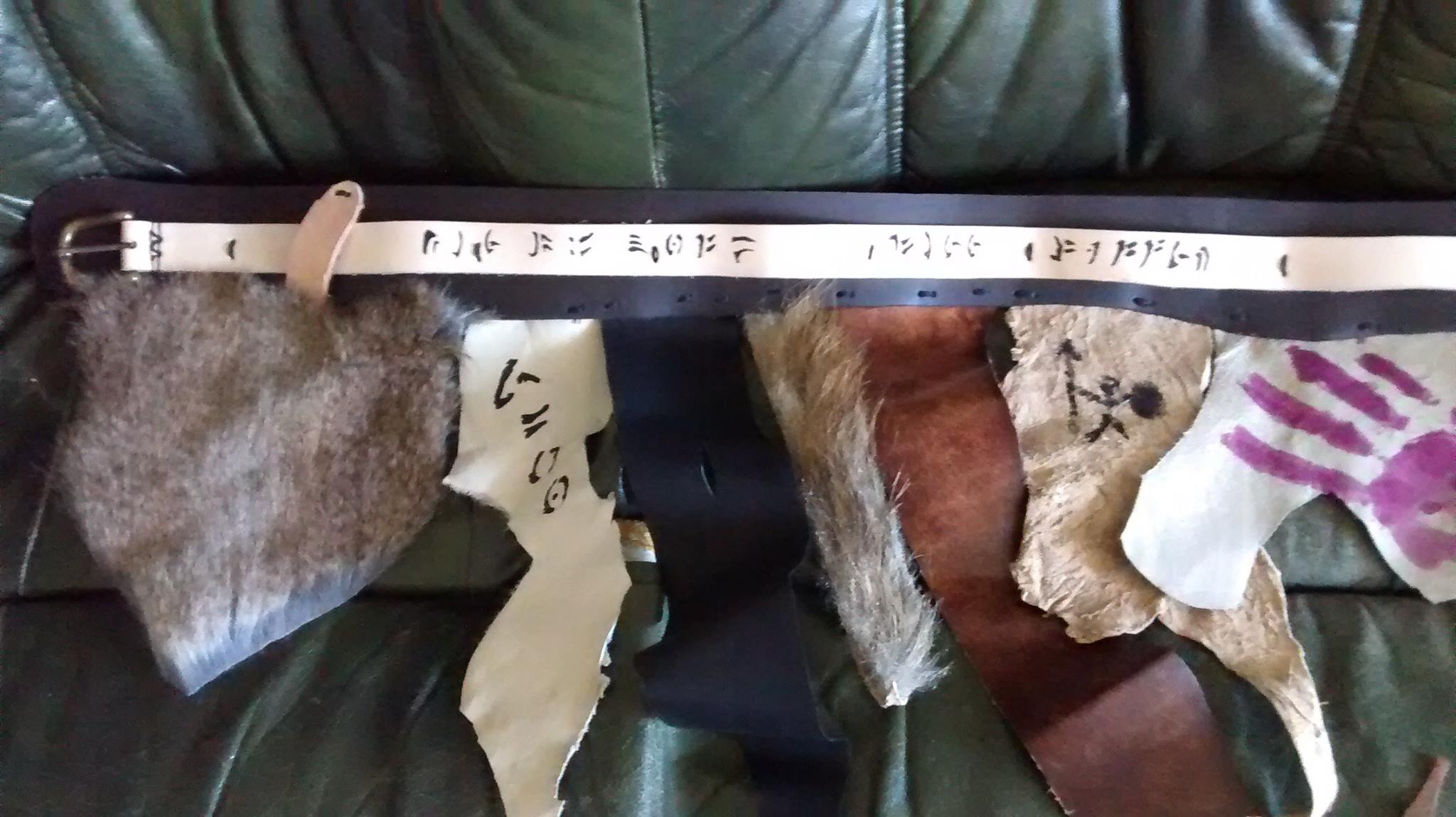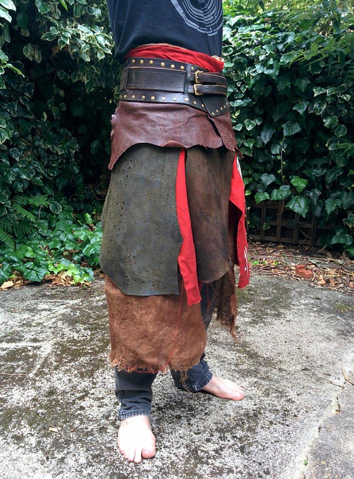 The easiest way to make a war skirt is to start with a belt, then rivet or sew a bunch of leather scraps to it/around it. Try to achieve a layered effect, with longer pieces behind, and shorter pieces in front. Be sure to weather the leather - hit it with rocks, drag it behind a car, basically beat it up a lot. Use mismatching scraps, make the stitching is large and irregular, etc. Add other materials like hessian or scraps of fur. I’ve attached a couple of pics of different skirmish crew war skirts to show you what I mean, though obviously the Imperial Orc players will have fancier ones to show off