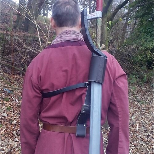 Darkblade have done some good backscabbards for greatswords in the past. Iāve seen people add leather straps to halberds and carry them on their backs (obviously take them off before going onto the battlefield).