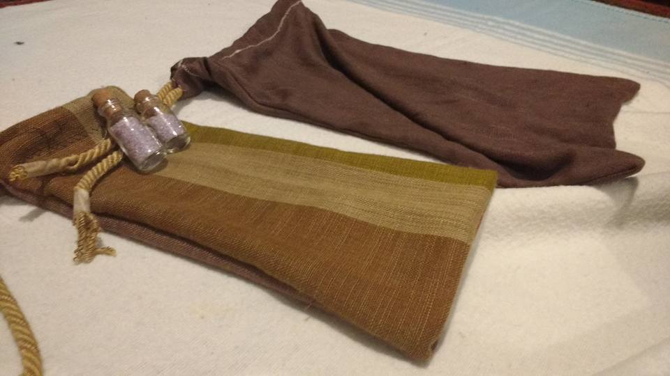 Made some draw string bags to carry around my stuff in! One is made from a second hand bag which I cut up and put back together and the other is made from the hood of a big brown robe/dress I got to wear under my chainmail. The draw string is made from some furniture piping cord.